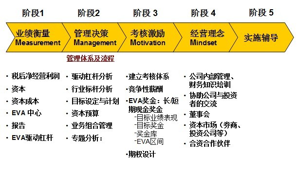 视野知成咨询团队通过五个阶段的工作,帮助企业逐步建立以EVA为核心的“4M”价值管理体系: